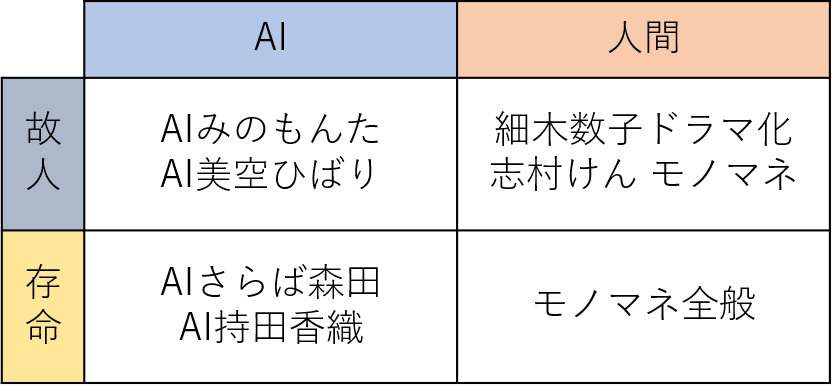 人 × 存命では、いわゆるモノマネ文化が該当します。